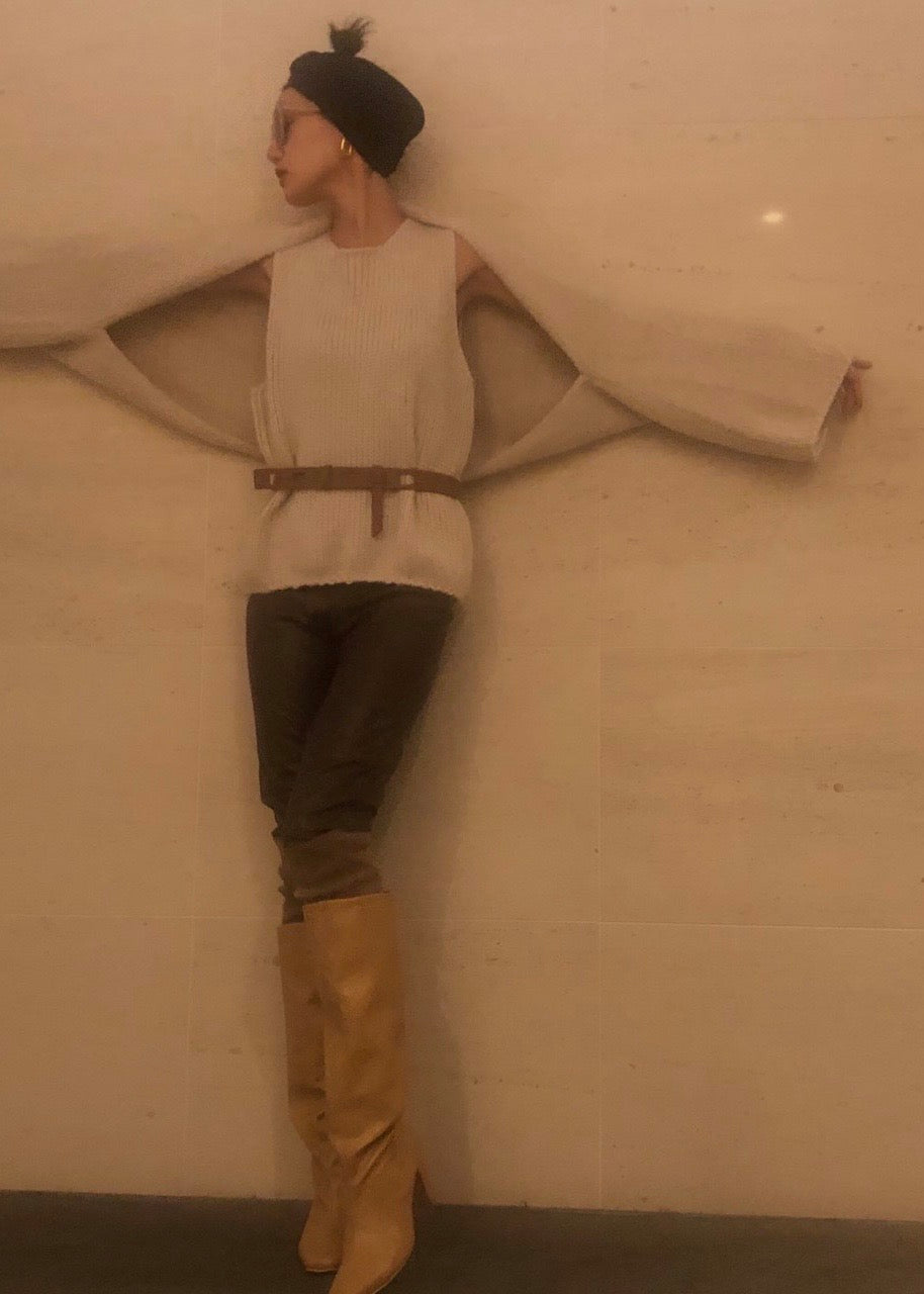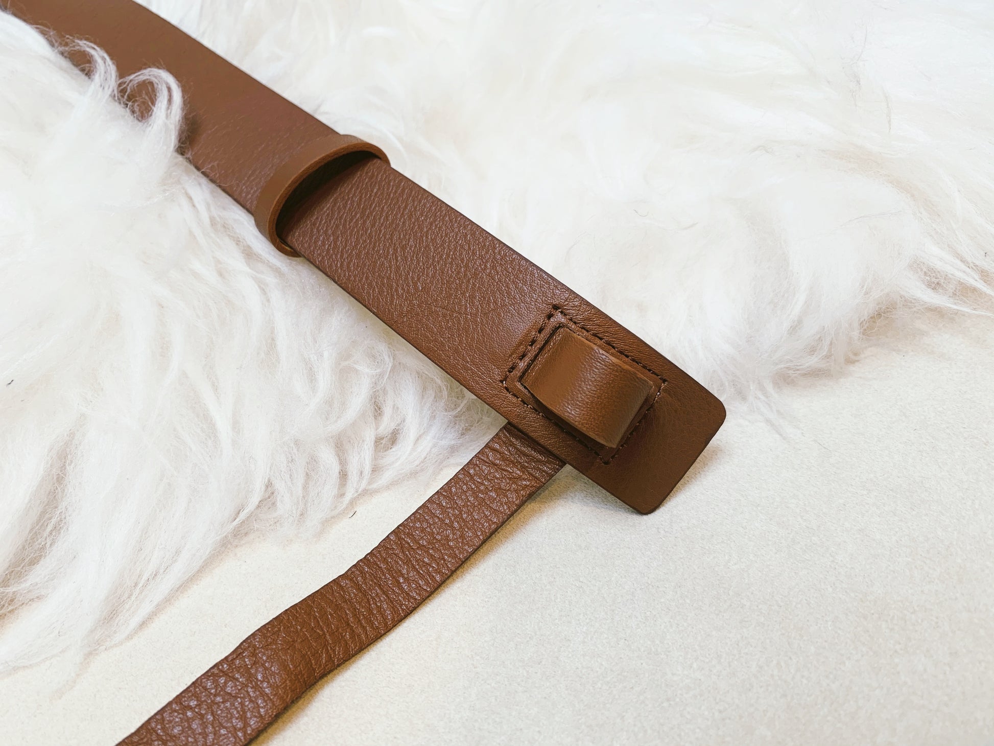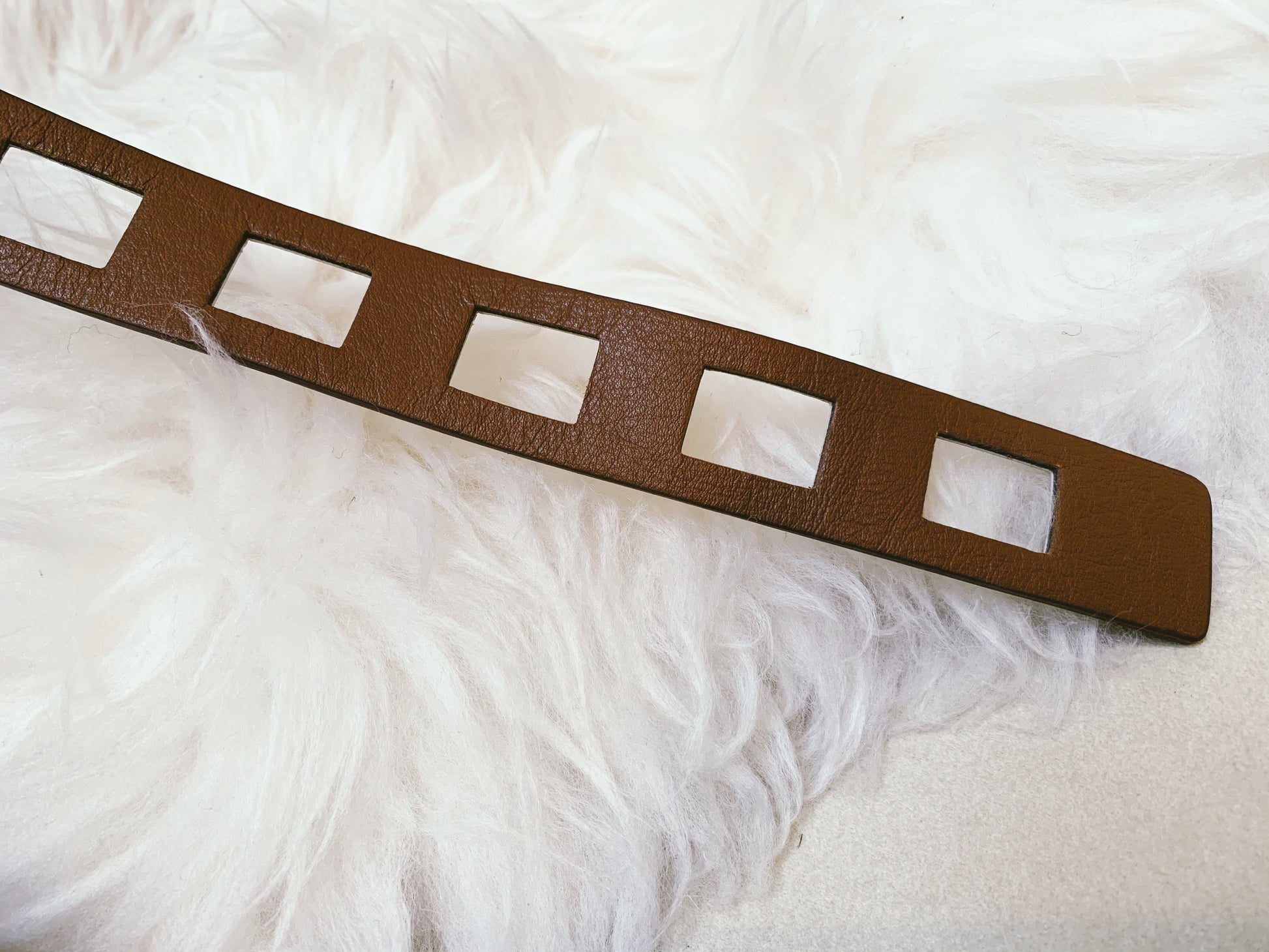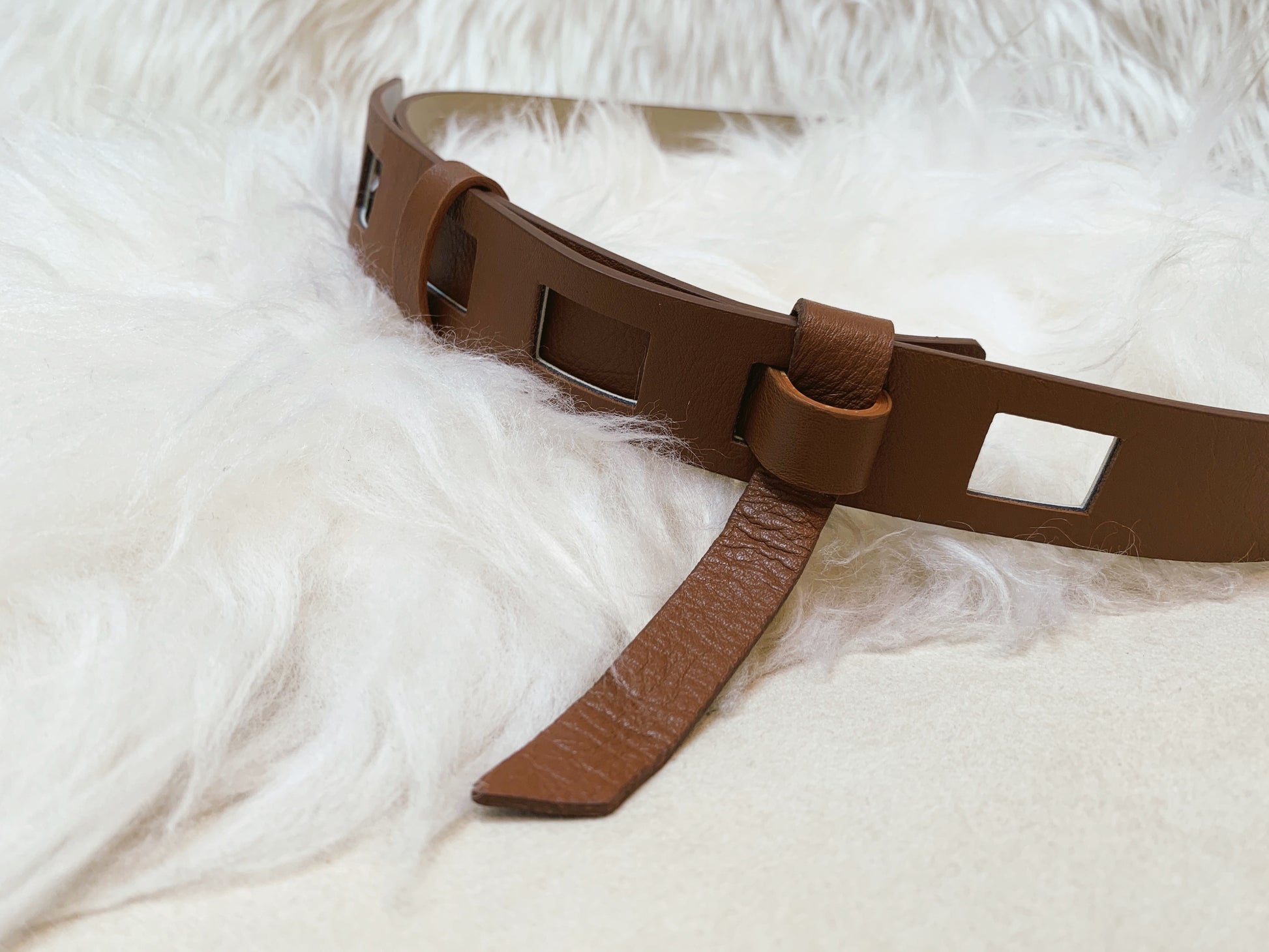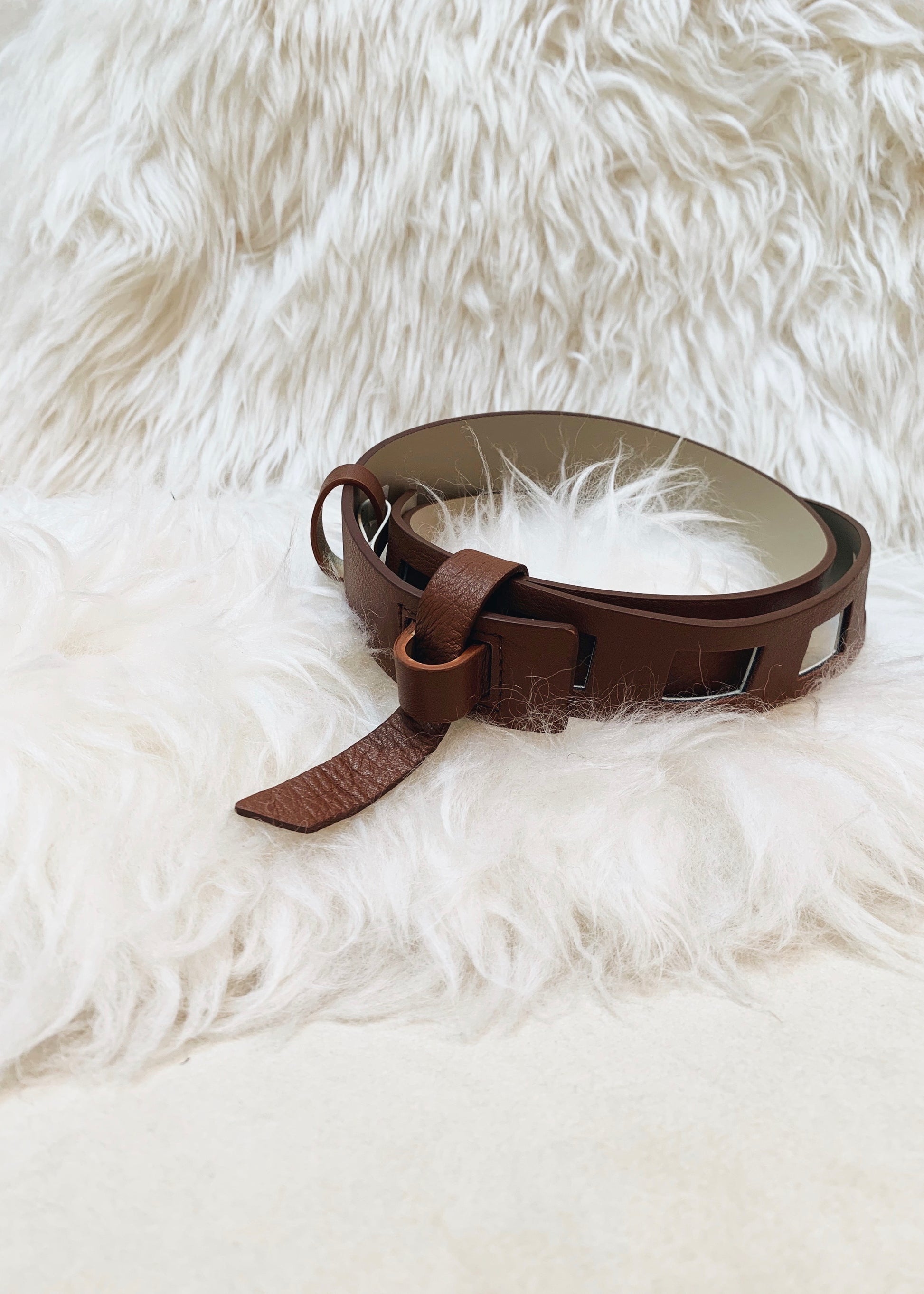 ブロックのようにスクエアにくり抜かれたボディがデザイン性のあるベルトは、コーディネートにおいて重くなりがちな印象を軽減し、アクセントとして活躍します。どんなアイテムとも相性が良いダークブラウンの色合いは、着こなしを洗練された印象に仕上げてくれます。