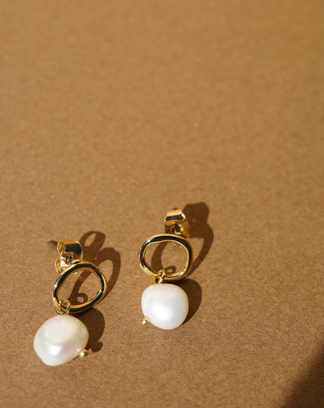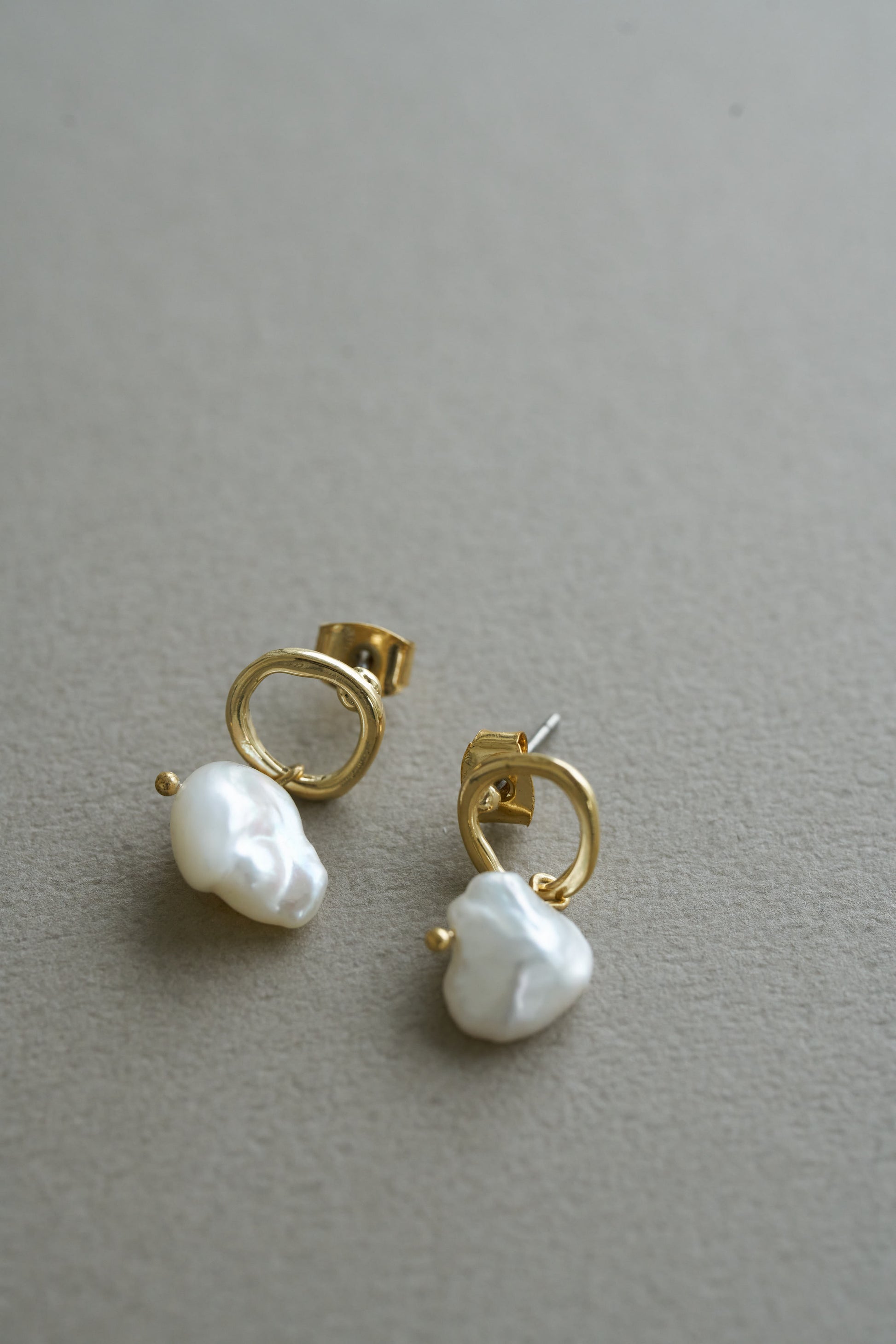 ブロックパールを使用したシンプルで洗練されたデザインのピアスです。パールと真鍮のリングが絶妙に組み合わさり、上品さとモダンさを兼ね備えたアクセサリーとなっています。パールの輝きが華やかさを添え、リングのデザインがユニークなアクセントを加えています。耳元で揺れるパールが上品な印象を与え、洗練されたスタイルを演出します。シンプルながらも存在感のあるデザインは、様々なシーンやスタイルにマッチし、日常から特別なイベントまで幅広く活躍します。素材やデザインの組み合わせが洗練されたアクセサリーは、おしゃれを楽しみたい方におすすめです。