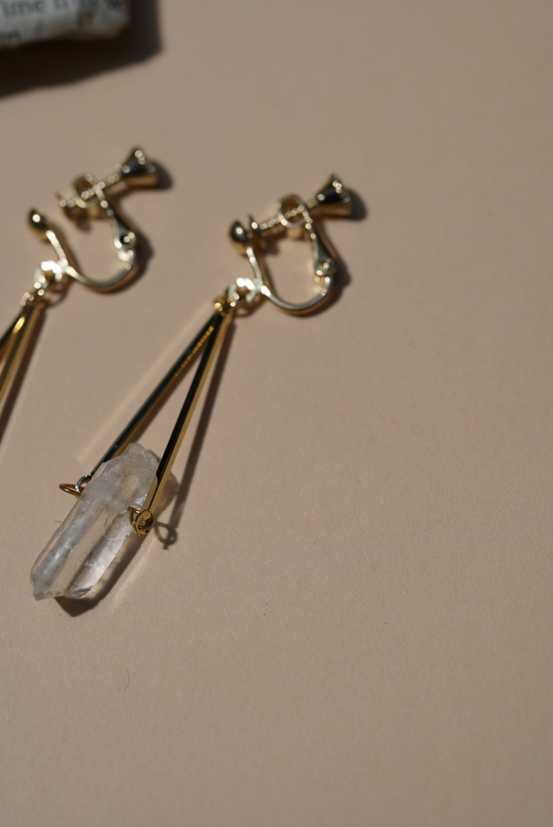 クリスタルの天然石がついた真鍮ピアスです。一つ一つが天然の石を使用しているため、微妙に形が異なりますが、それが魅力の一つです。