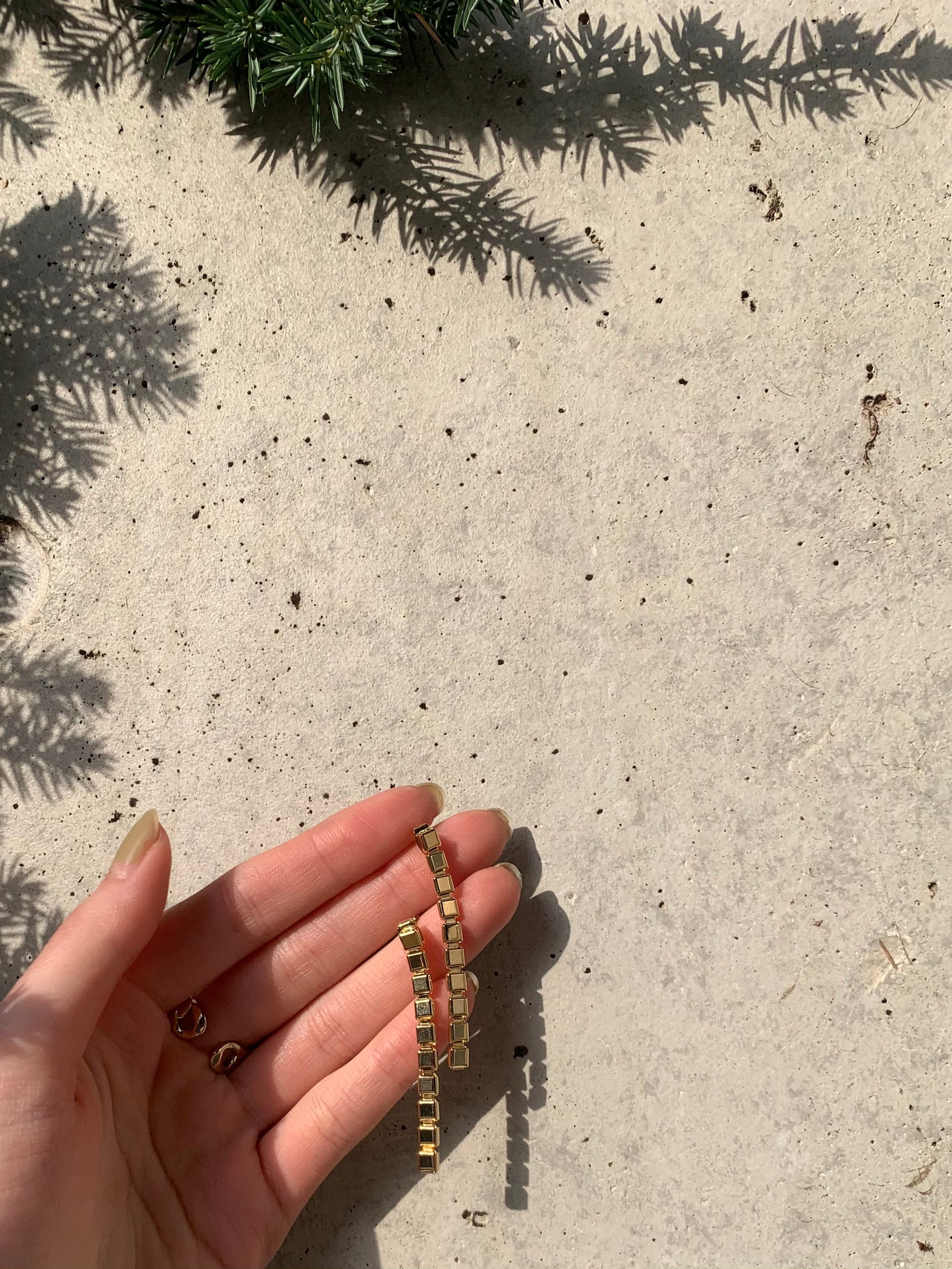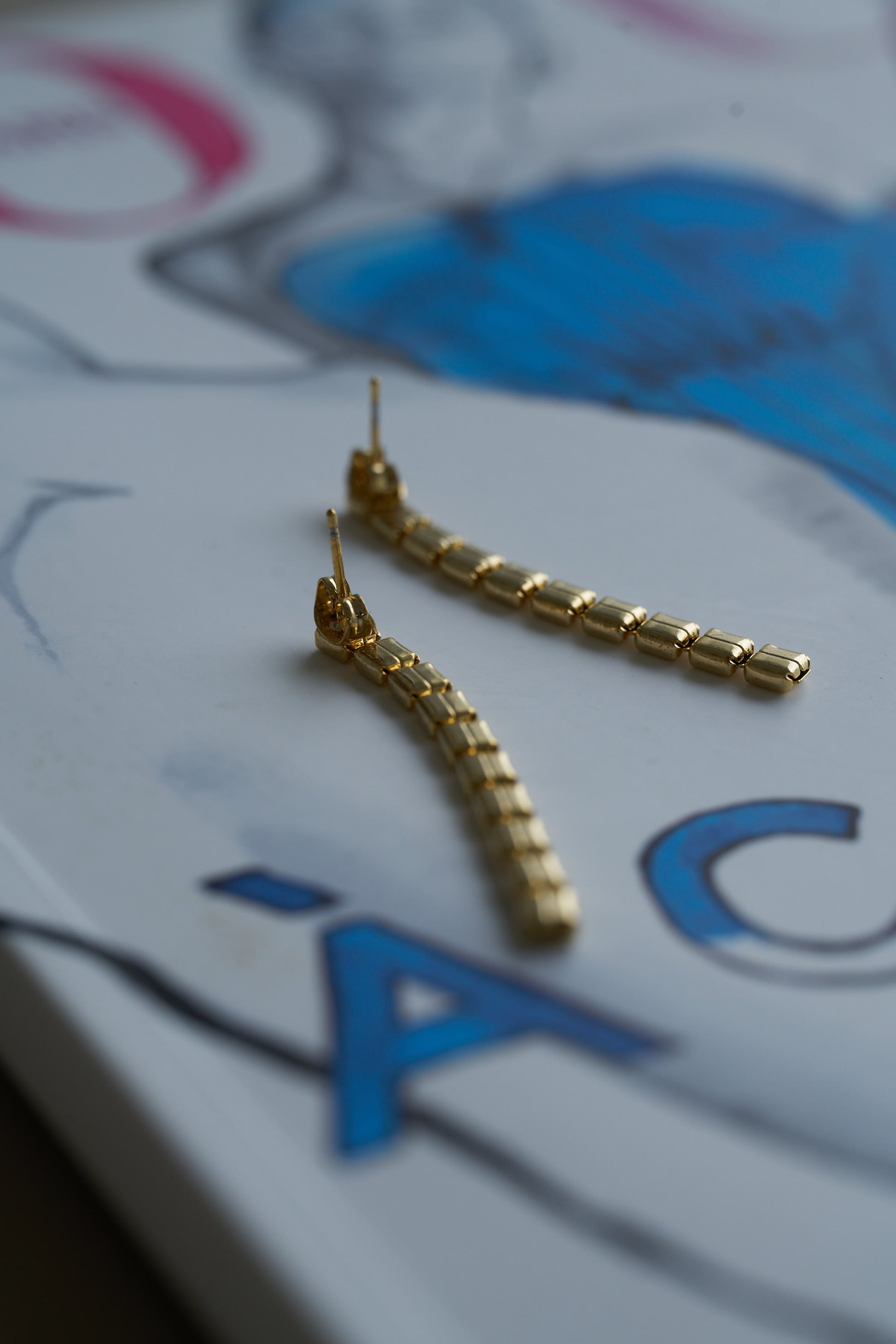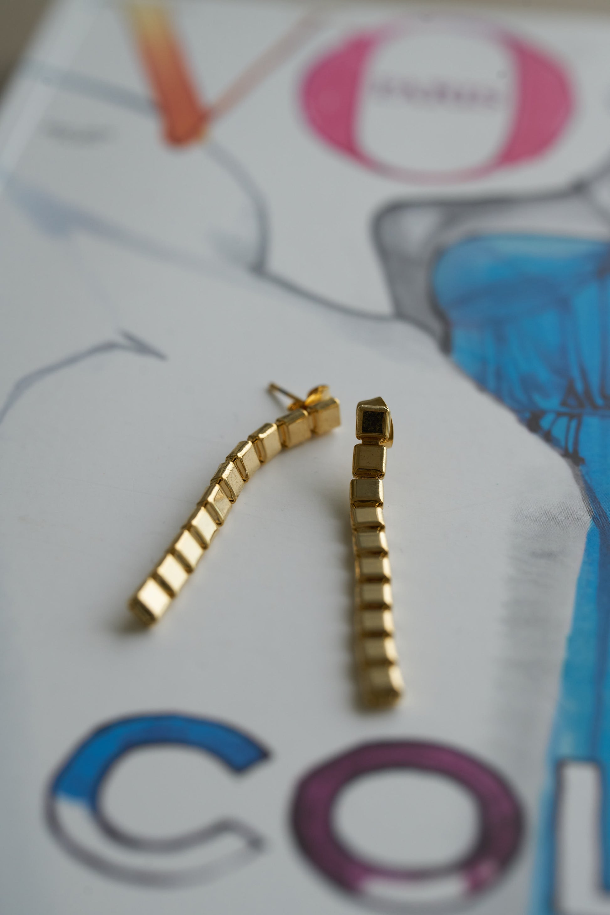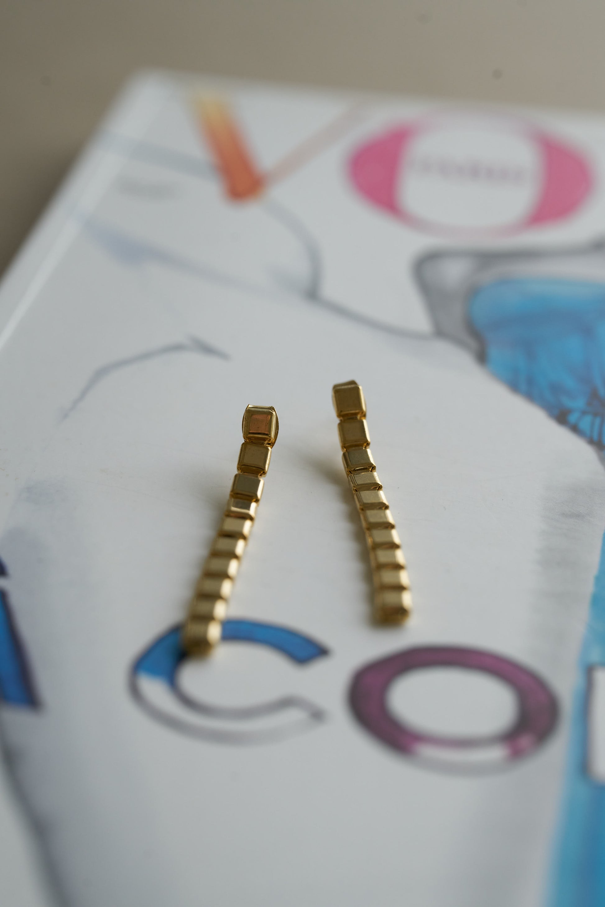 このピアスは、ブロック状が連なってできた棒状のデザインが特徴です。動きのあるデザインが、装着する方の耳元で洗練された印象を与えます。高品質なゴールドカラーが、エレガントで上品な雰囲気を演出します。シンプルながらも存在感のあるアクセサリーとして、さまざまなコーディネートにアクセントを加えることができます。